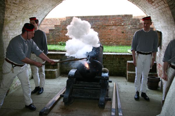 The Portsdown ArtilleryVolunteers firing a 13-inch mortar at Fort Nelson