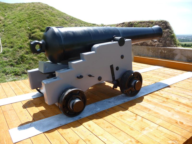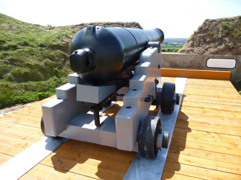 The 64pr. R.M.L. 58cwt mounted on a Garrison Standing Carriage and double decked siege platform, on the West Rampart at Fort Nelson.