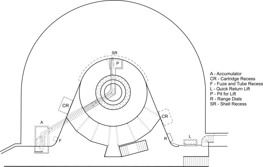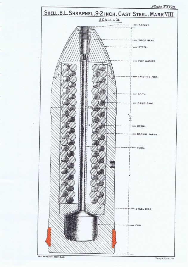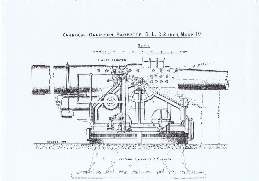 1911-14 emplacements for Mark VB mountings. The original 9.2-inch guns were removed from the two flank emplacements in 1913 and replaced with new Mark IX barrels in September 1914. The centre barrel was not replaced and was scrapped in 1928.