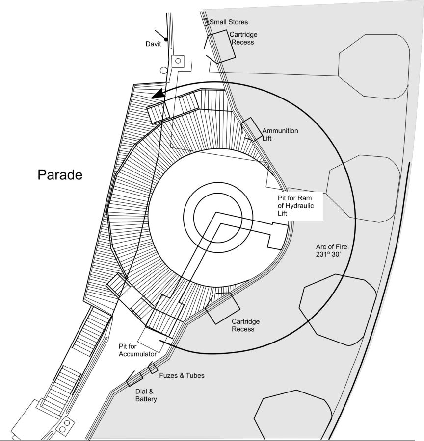 Emplacements for 2 x 9.2-inch Mark X BLs installed in 1898-1900. A third added in 1900.
