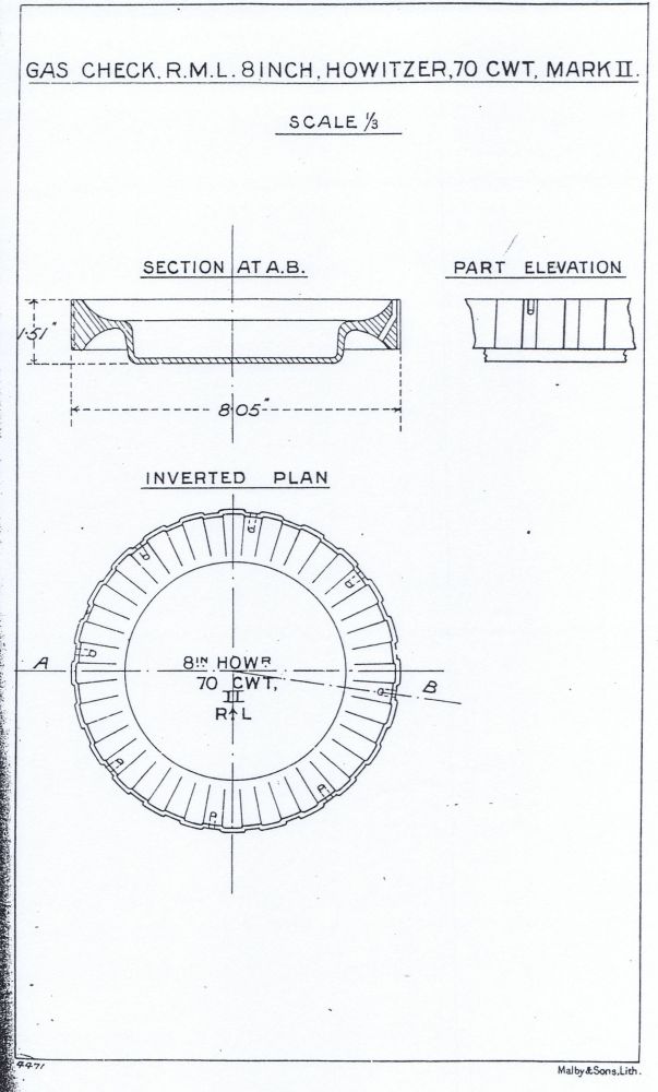 Bottom Centre Attached gas-check Mark II for RML 9 inch studded ammunition. The face shown is exposed to the powder gas. The hole is indicative of an attached gas-check for studded ammunition. The hole surrounds a circular collar on the attaching plug, permitting the gas-check to rotate relative to the projectile on loading, aligning the projections on the gas-check with the studs on the projectile. The flat disc around the hole is where the head of the attaching plug lies. The wavy nature of the gas-check disc is clearly visible. The six wide projections around the edges are indicative of a 9 inch gun with Woolwich rifling.