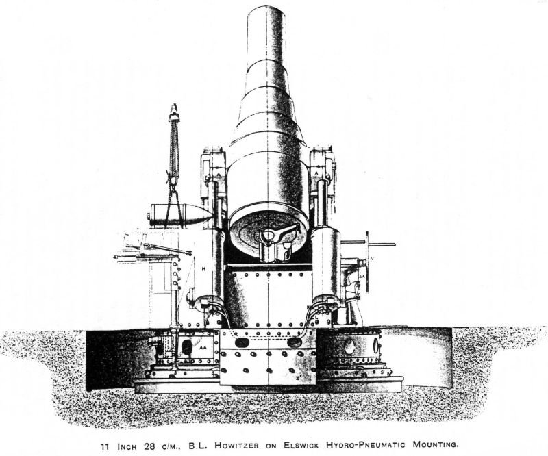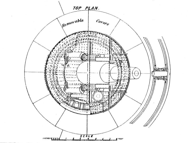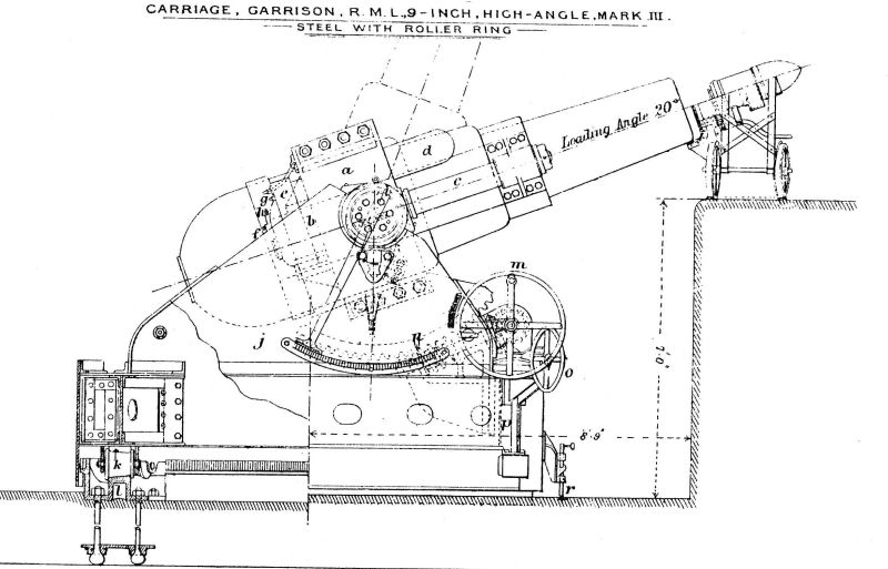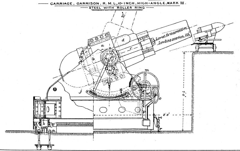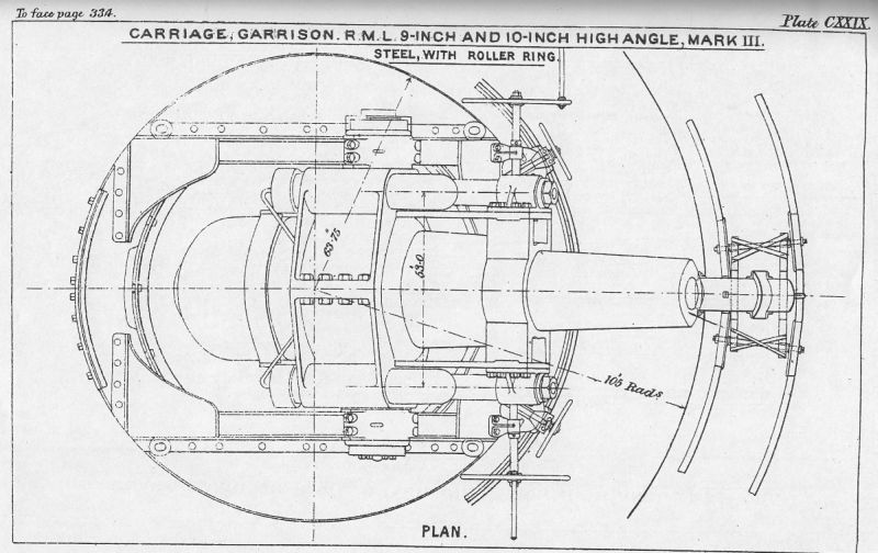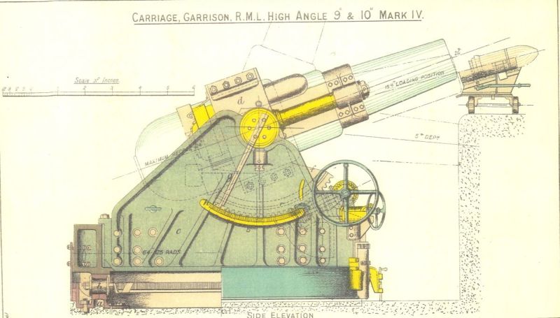 The attempts to rifle mortars proved useless and so the Artillerists turned to existing armaments, adapting them for high angled fire. They could then be mounted in batteries shielded behind earthworks and set back from the coast line of the harbours they were intended to protect. The R.M.L. 9-inch was chosen. It was conveted by being relined, the existing vent hole being plugged and relocated so that it entered the chamber at 2.5 inches from its end. The rifling was now 27 grooves of plain polygroove section. It was now designated 9-inch Mk 6. Some 9 inch R.M.L.s were relined to bring them up to 10-inch calibre and were designated 10-inch MkIII. A trial took place at Shoeburyness in 1884 which gave accurate results at 10,000 yards. The results were considered satisfactory and in 1886 plans were drawn up to install a gun at Warden Point of the Isle of Wight for further trials. This first mounting was the 10-inch R.M.L. 'Long Range' mounting. it proved satisfactory for high angle fire up to 35 degrees.