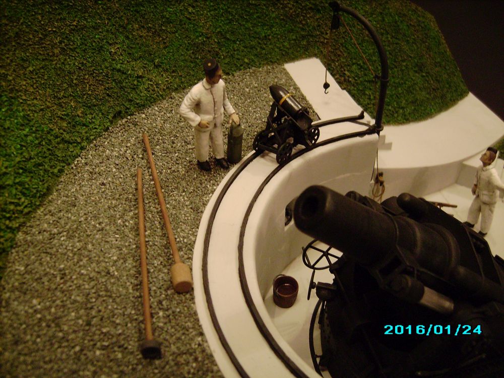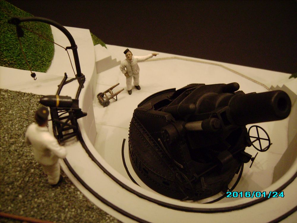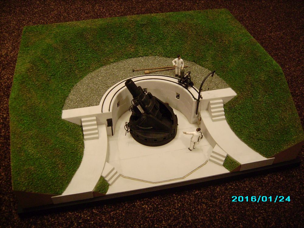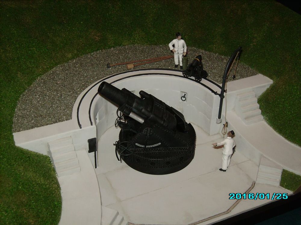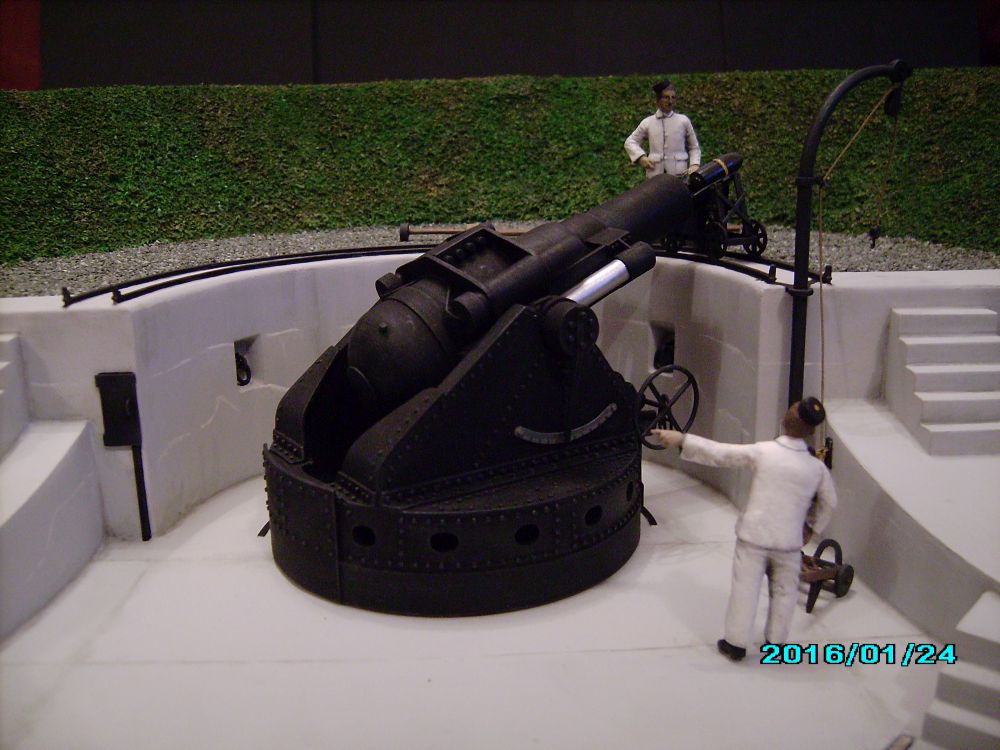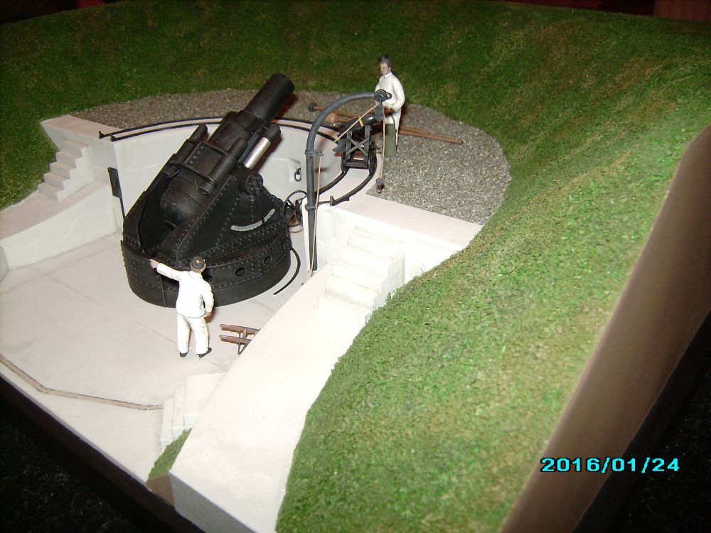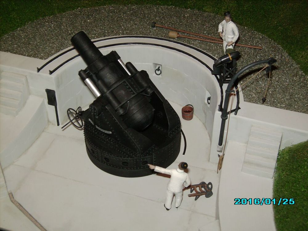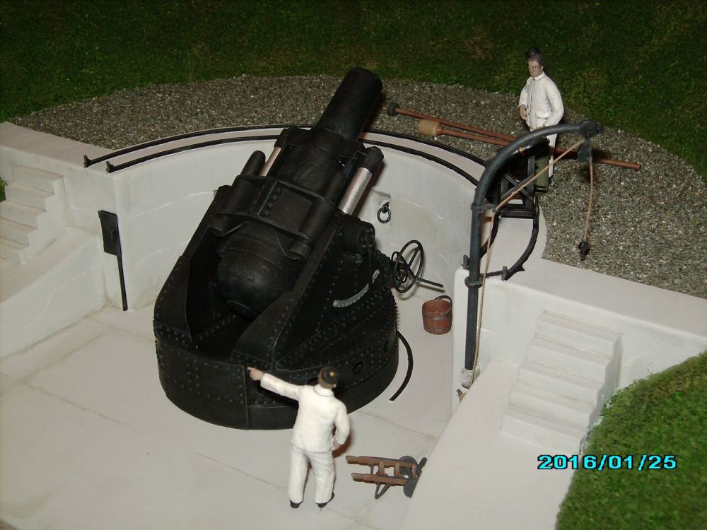 Model of a 9-inch R.M.L. gun by Nicholas Baigent who based this on one of the four guns originally on Mark III mountings at Tregantle Down High Angle Battery, Plymouth, in 1895. The model is in 1:40 scale, scratchbuilt in plasticard, with the barrel turned from nylon rod. The figures are scaled down conversions of 1:35 WWII German infantry figures, adapted to represent two of the late-Victorian gun crew