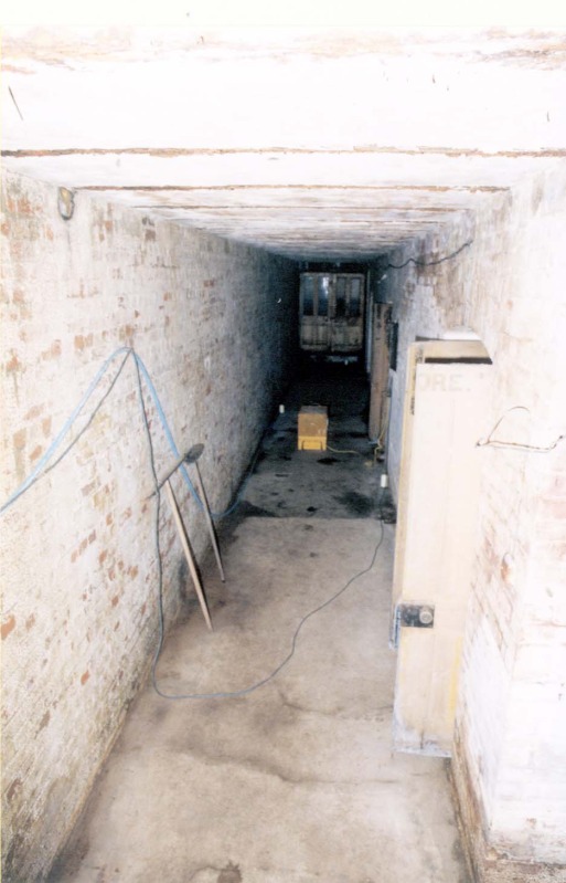 The view along the magazine passage, the doors at the far end were installed when the casemates at that end were use for accommodation and are part of the centre. Beyond the doors is a second saa fuze and tube store. The open doors for one of the shell stores can be seen in the foreground.