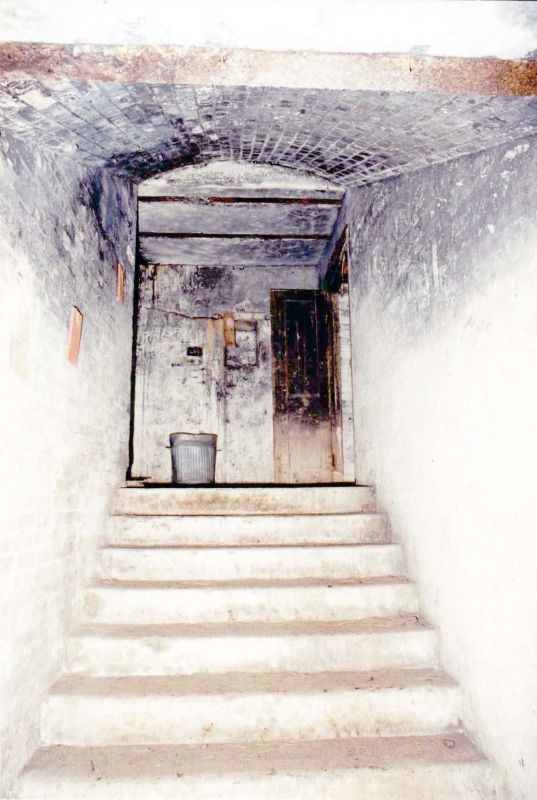 At the eastern end of the magazine passage a second flight of steps leads back up to the other courtyard. At the top of the steps is a second fuse and tube store, one door of which can be seen open |