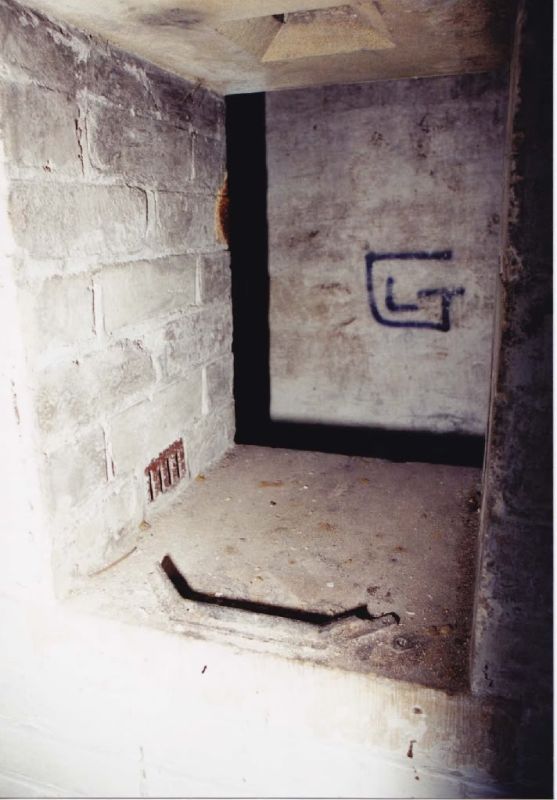 In the passage, fitted to the wall either side of the door to the cartridge store, can be seen the remains of the barriers for the shifting lobby. At the far end are the steps leading up to lamp room. |