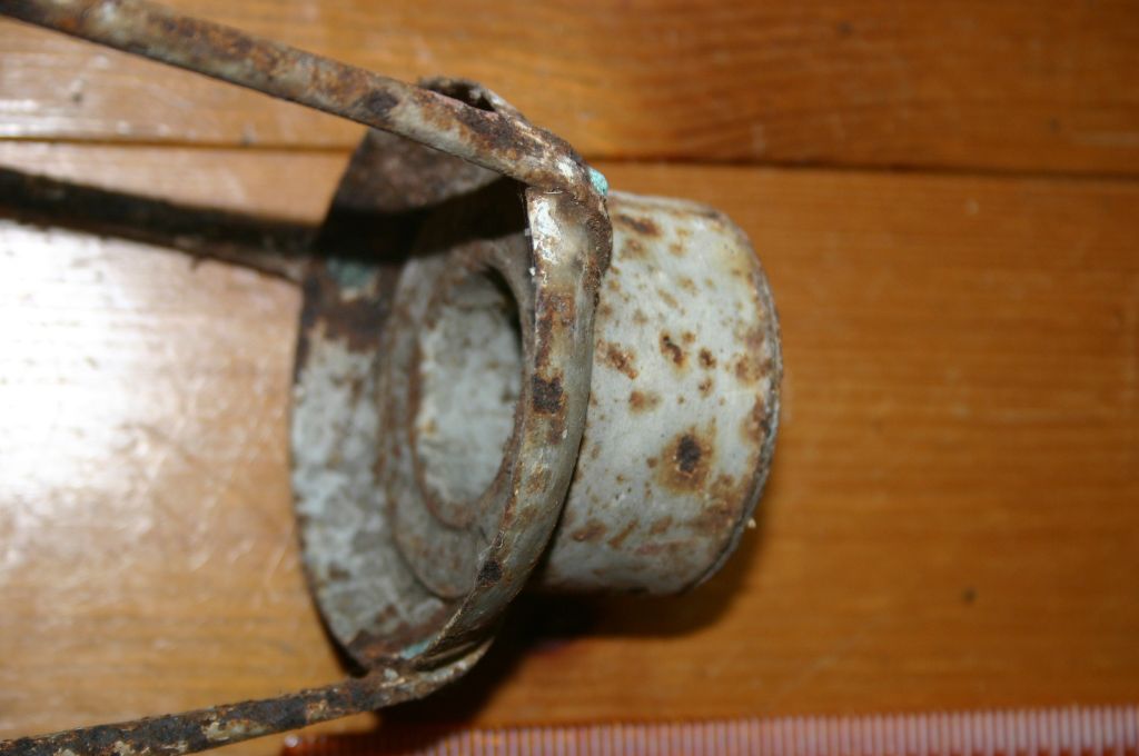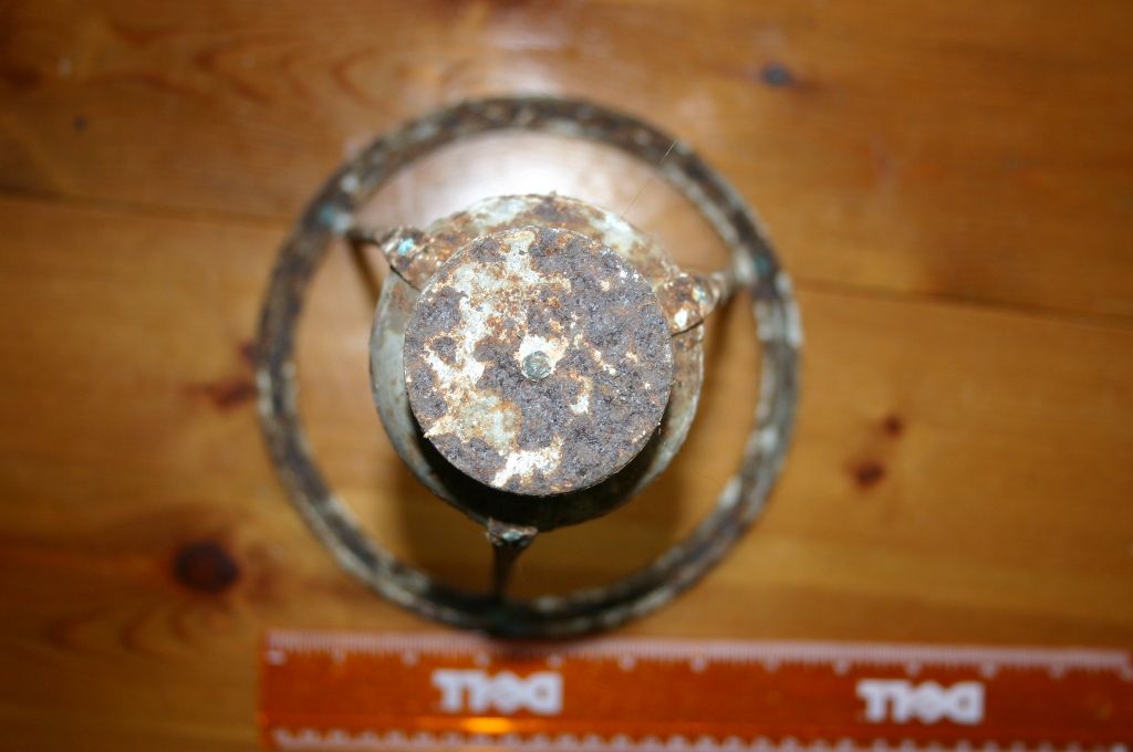 The Overhead lamp was used to illuminate the passages of magazines where an overhead lighting passage was provided, such as on the Spithead sea forts at Portsmouth. It was placed in a circular recess in the floor of the lighting passage so that the glass globe hung through into the passage beneath. The example above is missing the burner and glass.