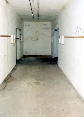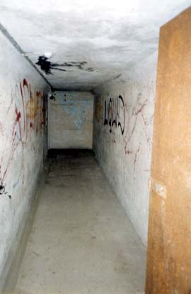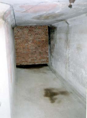 All of the above structures are now underneath three detached houses and are no longer accessable. Inside the work are two main magazines comprising a shell and cartridge store separated by a passage that contained the shifting lobby for the cartridge store. The magazine in the southwest corner was blocked for structural reasons but the owner of the house above it had a few photos of it. First the stairway down to it. |