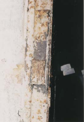 At the west end is something of a mystery. The end casemate has a moulded lip and drip over the casemate opening and a steel frame set into the opening. Along the top are three hinge pins and remains of two fittings, one each side that look as though they may have been hooks though these are now cut away. It's just speculation but there may have been some sort of apparatus here to get the stores up and down from the casemate to ground level. |