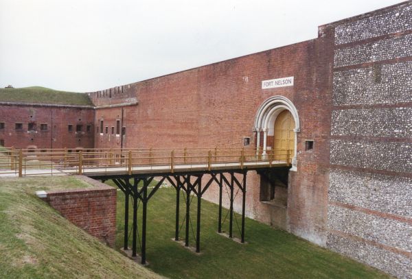 This fort is situated 250 feet above sea level and is 2,000 yards east of Fort Wallington (centre to centre). The trace is six sided, with deep ditches protected by two storey demi-caponiers on the east and west angles, with a two storey double caponier at the north salient. Above each of the caponiers is a mortar battery for three guns in each. The counterscarp walls remain as originally planned without revetment. The original upper west entrance was approached over a cast iron bridge with a lifting section at the fort end. This entrance gave access to the fort at parade level. The lower west entrance was also defended by a Guthrie lifting bridge and gave access to the fort at barrack block level.