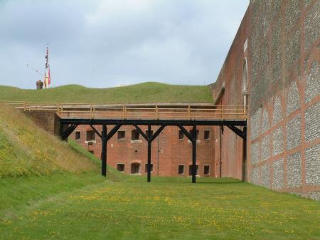 The upper east entrance was over a long fixed bridge and guthrie lifting bridge. This entrance entered the fort at parade ground level.