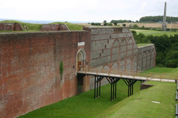 Fort Nelson had two entrances. The lower west one was flanked by the guard room with three cells and a stable for three officer's horses. This entrance gave access to the barrack block. It was defended by a minor branch of the ditch. A special lifting bridge called a Guthrie bridge was fitted to both entrances of each of the forts on Portsdown Hill. This withdrew into the fort after it had been lifted. The huge wooden gates of the fort are studded with metal to give greater protection.