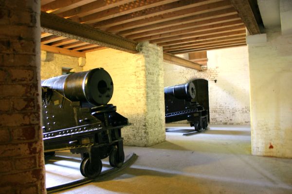 For flank defence of the main branches of the ditch, casemated buildings that projected into the ditch were constructed to mount short range guns. These guns were specially adapted to fire case shot only. At Fort Nelson there were two smaller, demi caponiers with guns to fire down the ditches of the flanks and one full, or double, caponier to defend the two major branches of the main North ditch. When the fort was competed the armament for the caponiers was undecided. It was not until the early 1880s that a special gun and carriage was adopted for the flank defence of ditches. This was the 32pr. Smooth Bore Breech loading gun of 42 cwt.