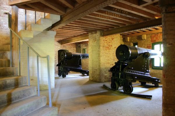 Fort Nelson was to be armed with four of these guns in the main north caponier and two in each of the demi caponiers. Musketry loopholes were placed in side galleries to flank the faces of the caponiers and a sally port on the upper floor of these flanking galleries allowed troops to access the ditch in order to clear obstructions under cover of darkness. Caponiers were a short lived feature of the Palmerston forts due to their vulnerability to plunging shot and mining.